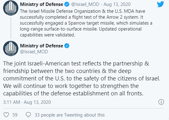 වර්තමානයේ හා මතුවෙමින් පවතින තර්ජනයන්ට එරෙහිව ජාතික මිසයිල ආරක්ෂණ හැකියාව ඉහළ නංවන බැවින් ඊශ්රායල් රජයට සහාය වීමට අමෙරිකාව කැප වී සිටින බවද විදෙස් මාධ්ය වාර්තා කරනවා.