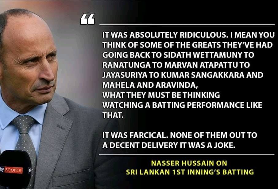 “තරගයට යන්න ඉස්සරවෙලාම පෙනුණු දෙයක් තමයි ශ්‍රී ලංකා කණ්ඩායමේ පිතිකරු ලයිස්තුවම ටෙස්ට් තරගයක් සඳහා මුහුණ දෙන්න තරම් සංවිධිත තත්ත්වයක නෑ කියන එක…. ඔවුන්ගේ ක්‍රියාකාරකම්, නැත්නම් තාක්‍ෂණය සම්බන්ධයෙන් ඔවුන්ට පාලනයක් තිබුණේ නෑ.. කිසි කෙනෙක් ඒ තත්ත්වයේ හිටියේ නෑ”“ඒ වගේ තත්ත්වයක් තියෙන විට,.. මා කියන්නේ කිසියම් පහරක් ගහන්න හෝ පාලනය කරගන්න, ඔවුන්ට හැකියාවක් ලැබෙන්නේ නෑ.. ඒ වගේම සන්සුන්ව, බුද්ධිමත්ව තීරණ ගතයුතු වෙලාවලදීත්, උමතුවෙන් වගේ තීරණ ගත්ත ආකාරයක් දකින්න ලැබුණා”“සමස්තයක් වශයෙන් ගත්තාම, තාක්‍ෂණයේදී වුණත්, සූදානම් වීමේදී නැත්නම් තීරණ ගැනීමේදී වුණත්, ශ්‍රී ලංකා කණ්ඩායම ඉතාමත් දුර්වල මට්ටමක හිටියේ…. ”