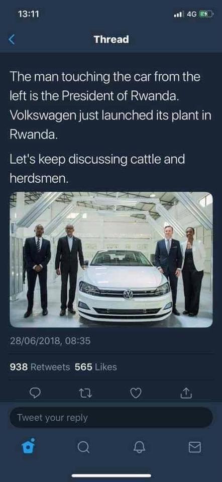 ජර්මන් රජයේ පූර්ණ අනුග්රහය මත ජර්මානු නිෂ්පාදනයක් වන වොක්ස්වැගන් මෝටර් රථ එකලස් කිරීමේ කම්හලක් එරට 2018 මාර්තු මාස විවෘත වීමත් සමඟ මිලියන 12ක ජනතාවක් ඉන්න රුවන්ඩාවේ ලක්ෂ පහක ජනතාවක් 2018 වර්ෂයේ තම රටේ එකලස් කරපු වොක්ස්වැගන් වාහන මිලදී ගැනීමට ලියාපදිංචි වෙනවා