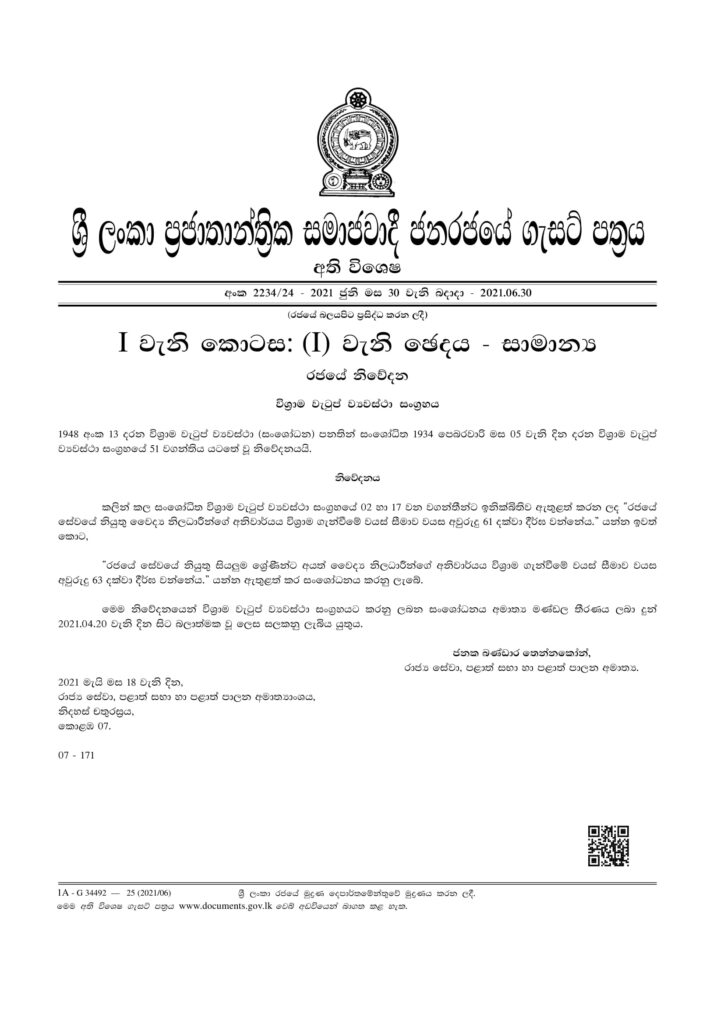 ඒ අනුව එම වයස් සීමාව දීර්ඝ කරන බව දන්වමින් ඊයේ නිකුත් කළ අතිවිශේෂ ගැසට් නිවේදනයකින් මේ බව දැනුම් දී තිබේ.