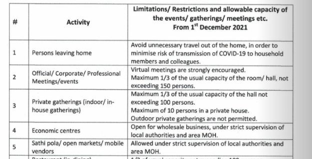 අද සිට ලබන15 වන දා දක්වා ක්රියාත්මක වන සෞඛ්ය මාර්ගෝපදේශ සෞඛ්ය සේවා අධ්යක්ෂ ජනරාල්වරයා නිකුත් කර තිබෙනවා. නව සෞඛ්ය මාර්ගෝපදේශ අනුව විවාහ මංගල්ය සඳහා උත්සව ශාලාවල ඉඩ ප්රමාණයෙන් 1/3ක ප්රමාණයක් හෝ උපරිම අමුත්තන් සංඛ්යාව 200 දෙනෙක්ට අවසර හිමිවන අතර එළිමහනේ පැවැත්වෙන විවාහ උත්සව සඳහා 250 දෙනෙකුට අවසර හිමියි. විවාහ මංගල උත්සව සඳහා මත්පැන් ලබාදීම තහනම්. ශාලාවල පැවැත්වෙන පෞද්ගලික උත්සව සඳහා උපරිම 100 දෙනෙකුට සහභාගිවිය හැකි වුවත්නිවස තුල පැවැත්වෙන උත්සවයකට සහභාගිවිය හැකි සංඛ්යාව 10ක් පමණයි. උසස් පෙළ සහ සාමාන්ය පෙළ විභාග සඳහා පමණක් උපකාරක පංති පැවැත්විය හැකි අතර, එකවර සහභාගිවිය හැකි ප්රමාණය සමස්ත ඉඩ ප්රමාණයෙන් 50% ක්. සිනමාශාලා සඳහා ආසන පහසුකම් මත 75 % ක පිරිසකට ඇතුල්වීම අවසර හිමිව ඇති අතර ක්රීඩා තරඟ පැමිණ නැරඹීමට ප්රේක්ෂකයින්ට තවමත්අවසර නැත.