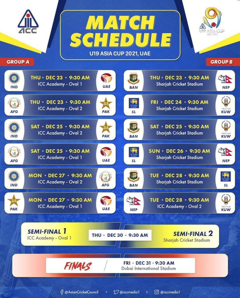 ලීග් ක්රමය යටතේ පැවැත්වෙන මූලික වටයේ තරග වලදී පළමු සහ දෙවැනි ස්ථානය හිමිකර ගන්නා කණ්ඩායම් අවසන් පූර්ව තරග වටයට සුදුසුකම් ලබනු ඇත. ශ්රී ලංකාව තරග වදිනු ලබන ‘බී’ කාණ්ඩයේ එක් තරගයක් හැරුණු කොට සෙසු තරග සියල්ලම සාජා ක්රිකට් ක්රීඩාංගණයේදී පැවැත්වේ. ‘ඒ’ කාණ්ඩයේ සියලුම තරග ක්රිකට් විද්යායතන ක්රීඩාංගණ වලදී පැවැත්වෙන අතර අවසන් මහ තරගය 31 වැනිදා ඩුබායි ජාත්යන්තර ක්රිකට් ක්රීඩාංගණයේදී පැවැත්වෙනු ඇත.