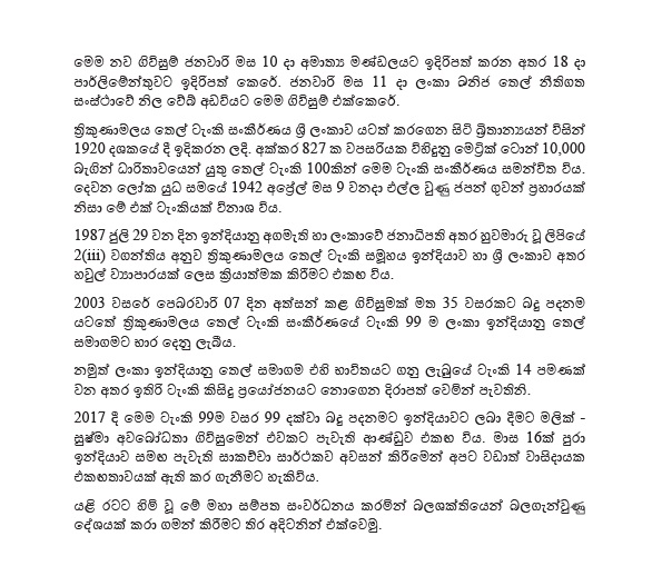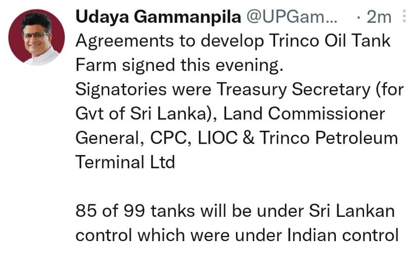 ත්රිකුණාමල තෙල් ටැංකි සංකීර්ණය සංවර්ධන ගිවිසුම්වලට අත්සන් තබා තිබෙනවා. ඒ අනුව ඉන්දියාවේ පාලනය යටතේ පැවති ටැංකි 99 න් 85 ක් ශ්රී ලංකා පාලනය යටතට පත් වනු ඇතැයි බලශක්ති අමාත්ය උදය ගම්මන්පිල ටිවිටර් නිවේදනයක් නිකුත් කර තිබෙනවා