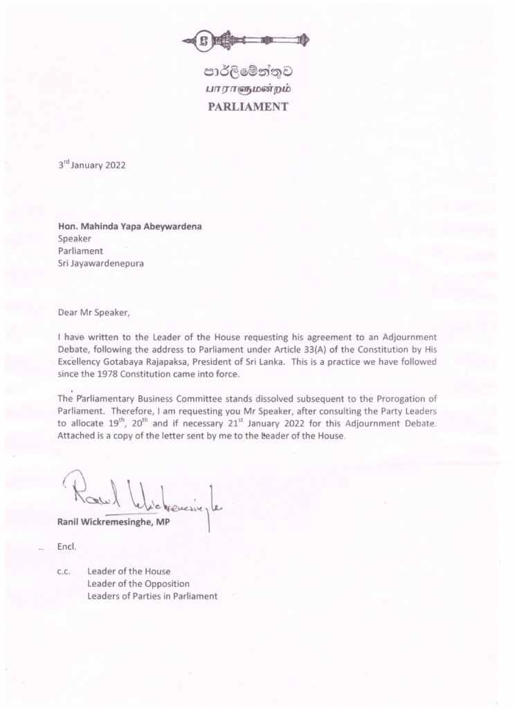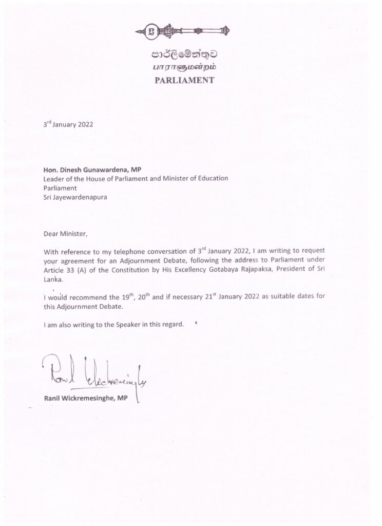 ආණ්ඩුක්රම ව්යවස්ථාවේ 33 (අ) වගන්තිය යටතේ එම කල්තැබීමේ විවාදය ලබාදීමට කටයුතු කරන ලෙසත් ඒ සඳහා සුදුසු දිනයක් ලෙස ජනවාරි 19, 20, හෝ 21 යන දිනයන් නම් කරන ලෙසත් වික්රමසිංහ මහතා සිය ලිපි මගින් සඳහන් කර තිබෙනවා
