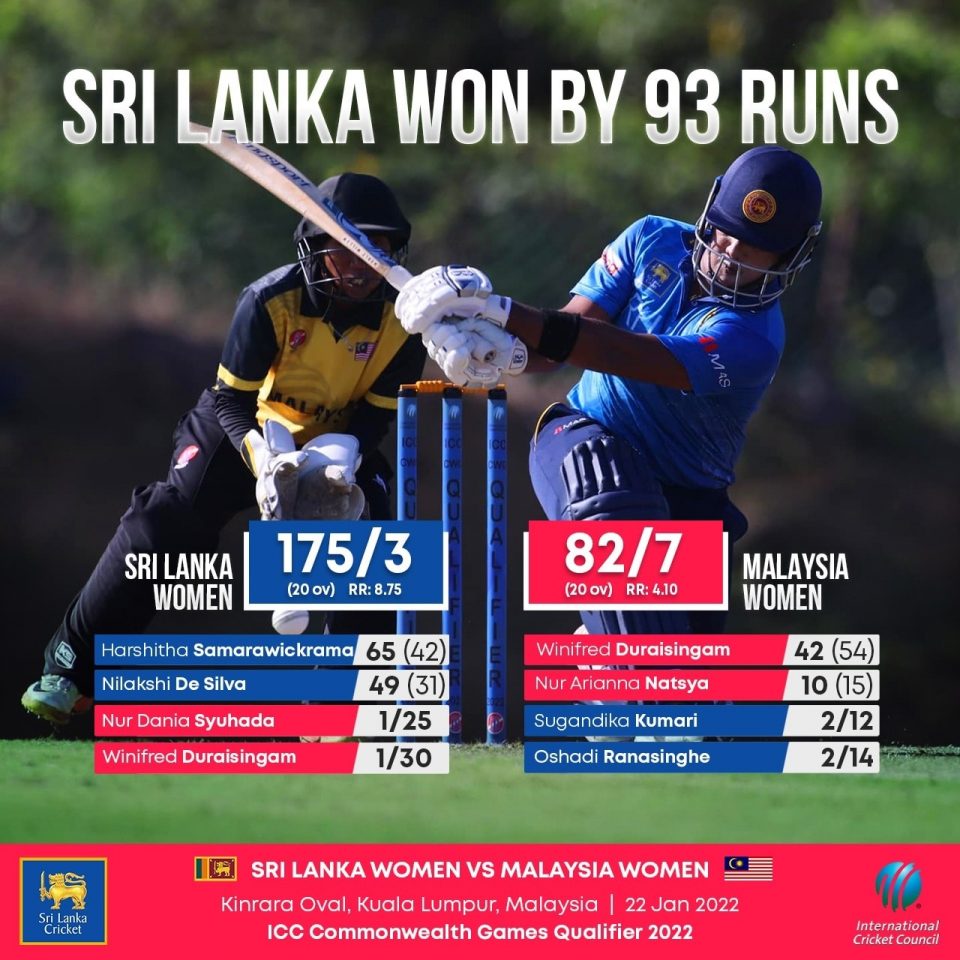 මැලේසියාවේ පැවැත්වෙන පොදු රාජ්ය මණ්ඩලීය ක්රීඩා උළෙලේ කාන්තා සුදුසුකම් ලැබීමේ ක්රිකට් තරගාවලියේ සෙනසුරාදා (22) පැවැති තවත් තරගයකදී ශ්රී ලංකා කාන්තා කණ්ඩායම ලකුණු 93 ක ජයක් සත්කාරක මැලේසියා කාන්තා කණ්ඩායමට එරෙහිව ලබාගැනීමට සමත්විය. එම ජයග්රහණයත් සමඟ චමරි අතපත්තුගේ නායකත්වයෙන් යුතු ශ්රී ලංකා පිල එම තරග වටය යටතේ සහභාගිවූ තරග 3 ම ජය ගනිමින් ඉදිරියට යෑම කැපී පෙනෙයි.
