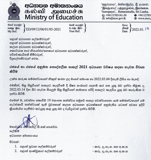 සියලුම පාසල් සිසුන් නැවත පාසල් වෙත කැඳවයි