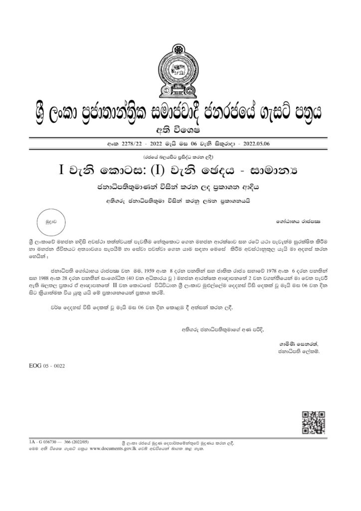 ඊයේ(06) මධ්‍යම රාත්‍රියේ සිට ගෝඨාභය රාජපක්‍ෂ ජනාධිපති විසින් හදිසි නීතිය ප්‍රකාශයට පත් කර ඇත.