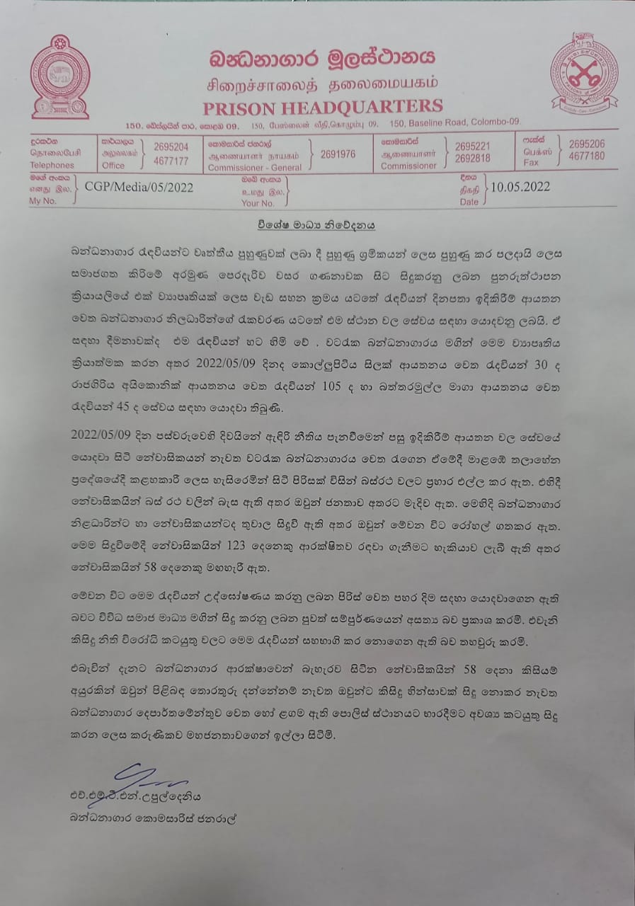 බන්ධනාගාර පුනරුත්ථාපන ක්රියාවලිය යටතේ රැඳවුවන් පුහුණු ශ්රමිකයන් බවට පත් කිරීමේ වැඩසටහනට මෙම සිරකරුවන්ද බන්ධනාගාර නිළධාරින් ගේ රැකවරණය යටතේ දායක කර ඇති බවත් ඒම සිරකරුවන් කිසිසේත් රට තුළ ඇතිවූ කලහකාරී ක්රියාවන් ට සම්බන්ධ නොමැති බවත් කොමසාරිස්වරයා අවධාරණය කරයි.