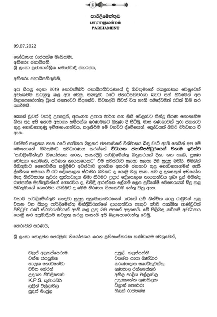 රට තුල උත්ගතව ඇති අර්බුදකාරී තත්වය තෙරුම්ගෙන ජනාධිපති ධූරයෙන් ඉල්ලා අස්වන ලෙස දන්වමින් ලිපියක් ශ්රි ලංකා පොදුජන පෙරමුණෙ මන්ත්රීවරුන්ගේ අත්සන සහිතව ජනාධිපති තුමා වෙත ඉදිරිපත්කර තිබෙනවා