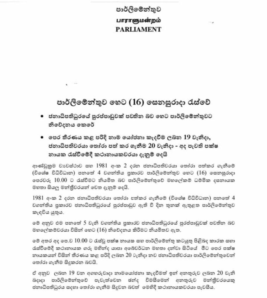 ගෝඨාභය රාජපක්ෂ මහතාගේ ඉල්ලා අස්වීමෙන් හිස් වූ ජනාධිපති ධූරය සඳහා නව ජනාධිපති වරයෙකු පත්කිරීම ලබන 20 වන දා සිදුකිරීමට පැවැති සර්වපාක්ෂික හමුවේ දී තීරණය කර තිබෙනවා. එ අනුව හෙට 16 පාර්ලිමේන්තුව රැස් වන අතර ජනාධිපති ධූරයේ පුරප්පාඩුවක් පැවතීම ගැන පාර්ලිමේන්තුවට දැනුම් දීමට නියමිතයි. ඉන්පසු එලබෙන 19 වන දා නාම යෝජනාවන් කැඳවීමෙන් අනතුරුව පසු දින ( 20 ) නව ජනාධිපති වරයෙක් පත් කර ගැනීමට නියමිත බව වාර්තා වනවා.