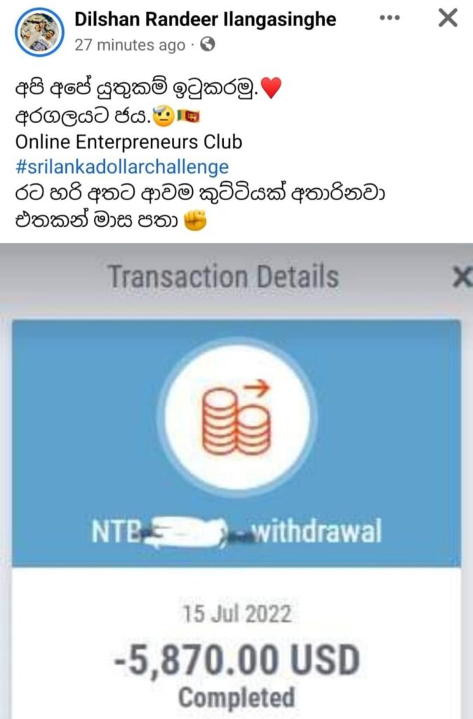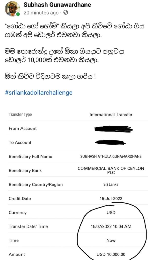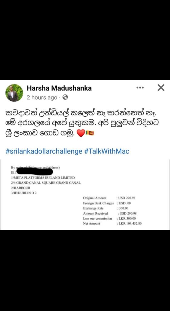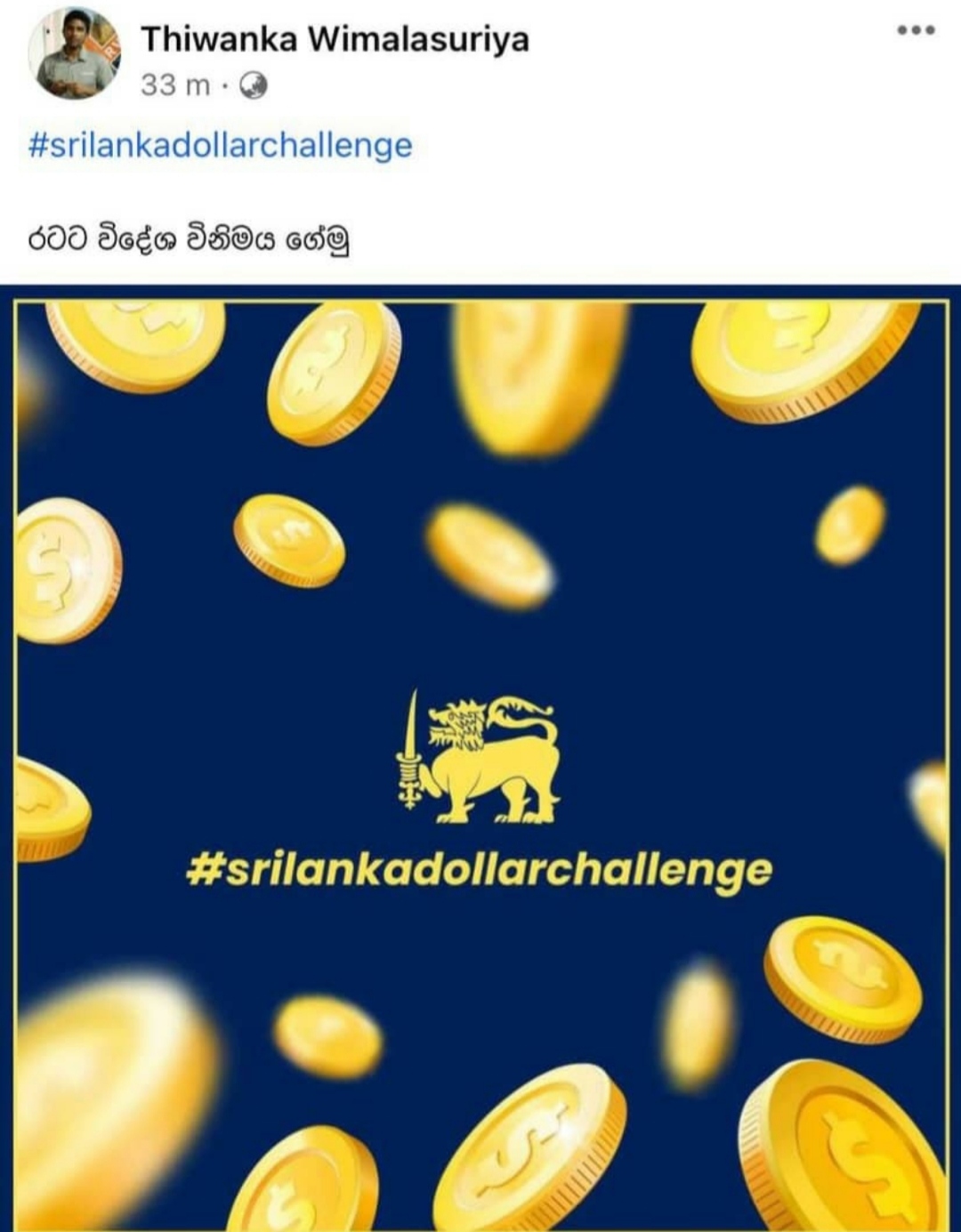 රට තුල උත්ගතව ඇති දැඩි ආර්ථික අර්බුදය හමුවේ ශ්රි ලංකාවට ඩොලර් ගෙනෙන වැඩසටහනක් සමාජ මාධ්ය මඟින් සාර්ථකව සිදුකරගෙන යන තරුණයන් පිරිසක් හදුනා ගෙන තිබෙනවා. #Srilankadollarchallenge නමින් මෙම වැඩ සටහන ඔවුන් සමාජ ජාලයට හදුන්වා දී තිබෙනවා.