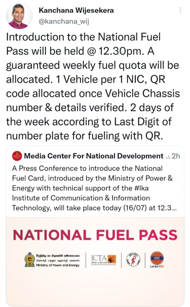 ‘ ජාතික ඉන්ධන අවසරපත්‍රය ‘ නමින් Q.R කේතයන් භාවිතයෙන් ක්‍රමවත්ව ඉන්ධන ලබාදෙන වැඩපිළිවෙළක් අද අරම්භ කිරීමට නියමිත වන බව බලශක්ති අමාත්‍ය කාංචන විජේසේකර මහතා ප්‍රකාශ කරනවා. මෙම ක්‍රමවේදය අනුව රථ වාහනයක් සඳහා සතියකට නිශ්චිත ඉන්ධන කෝටාවක් හිමිවන අතර වාහන අංක තහඩුවේ අවසාන ඉලක්කමට අනුව සතියකට දෙවතාවක් QR කේතය පෙන්වා පිරවුම් හලෙන් ඉන්ධන ලබාගැනිමට හැකියාව ලැබෙනවා.