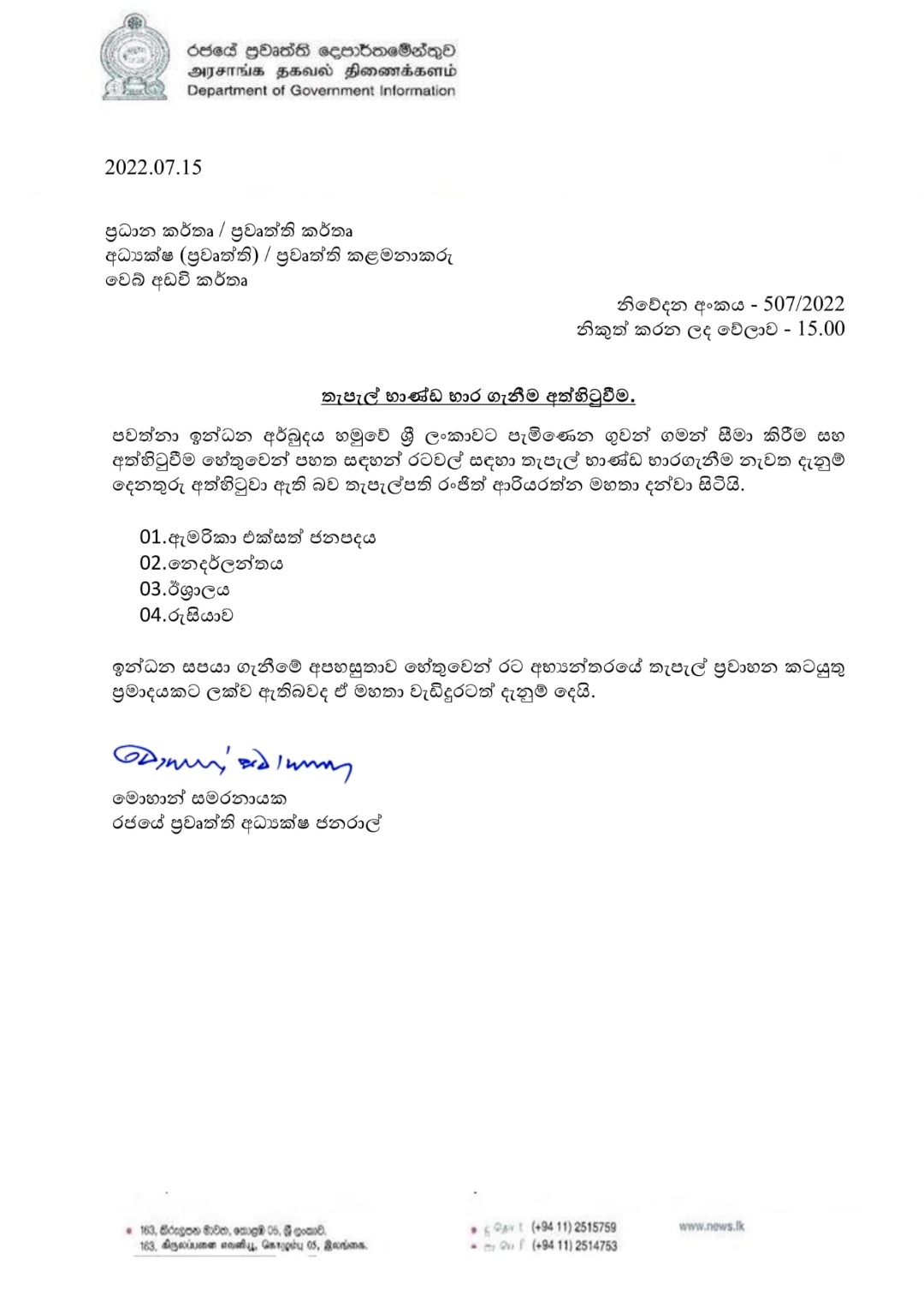 රට තුල උත්ගතව ඇති ඉන්ධන හා ප්රවාහන අර්බුදය හේතුවෙන් රටවල් කිහිපයක් සඳහා තැපැල් භාණ්ඩ භාර ගැනීම දැනුම් දෙන තුරු අතිහිට වූ බව තැපැල් දෙපාර්තමේන්තුව ප්රකාශ කරනවා. එ අනුව