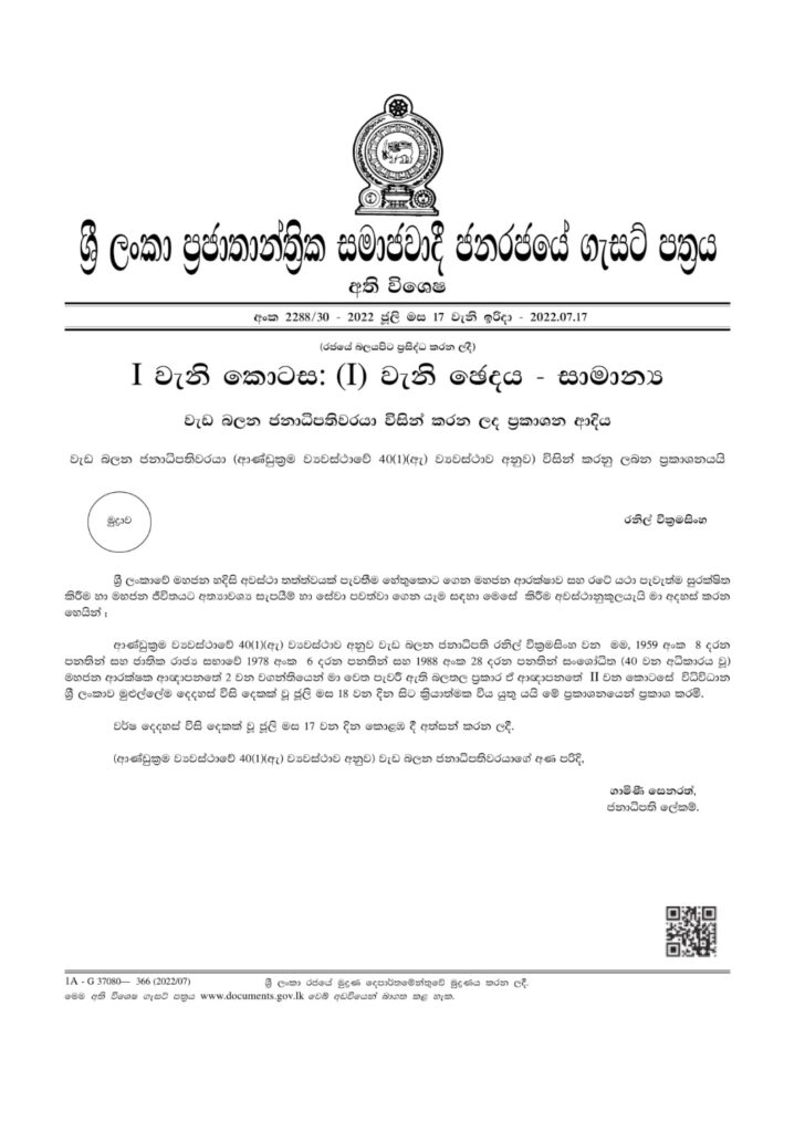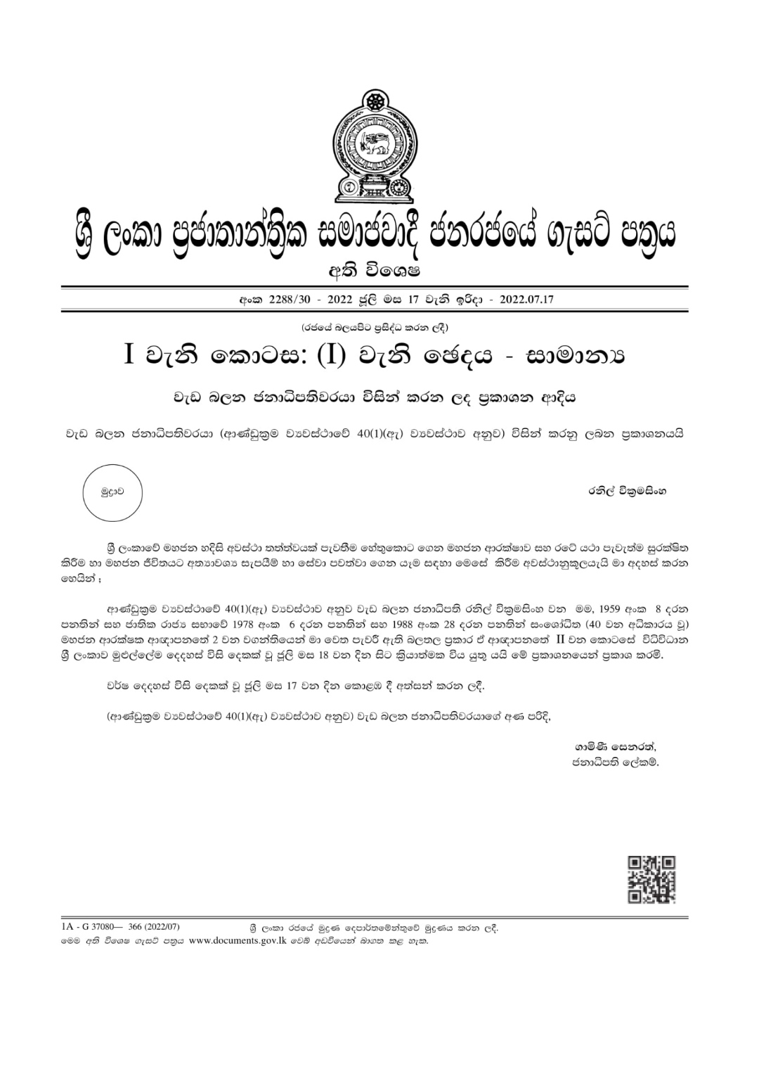 වැඩ බලන ජනාධිපතිවරයාගේ උපදෙස් මත ජනාධිපති ලේකම් ගාමිණී සෙනරත් විසින් රට පුරා හදිසි තත්වයක් පනවා ගැසට් නිවේදනයක් නිකුත් කර තිබෙනවා. මහජන හදිසි තත්වයක් රට තුල පැවතීම, මහජන ආරක්ෂාව සහ අත්යවශ්ය සැපයීම් සහ සේවාවන් පවත්වා ගෙන යෑම යන කාරණා සැලකිල්ලට ගනිමින් හදිසි තත්වයක් ප්රකාශයට පත්කළ බවයි වාර්තා වන්නේ.
