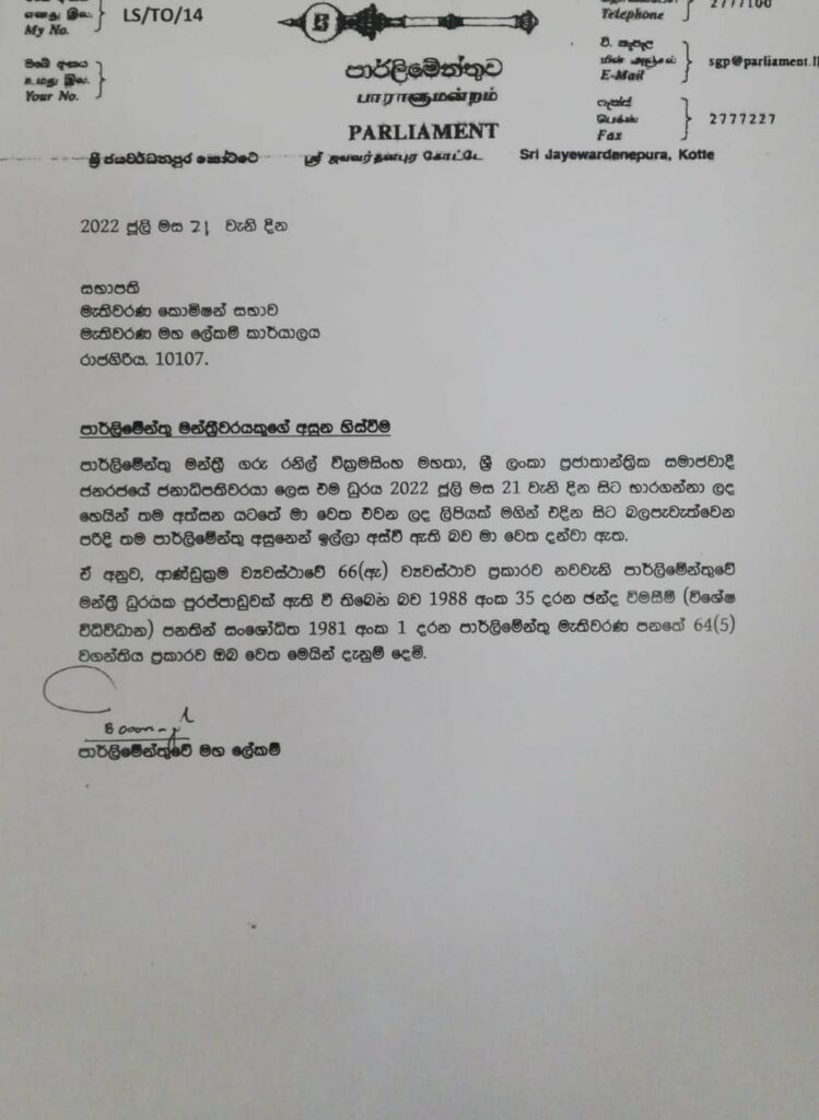 රනිල් වික්රමසිංහ මහතා අභිනව ජනාධිපති වරයා ලෙස තේරී පත්වීමෙන් එතුමා මෙතෙක් කටයුතු කළ මන්ත්රී ධූරය හිස්ව ඇති අතර නව ජනාධිපතිවරයා විසින් තමන් කටයුතු කළ ධූරයෙන් ඉල්ලා අස්වූවා සේ සලකා තමා වෙත ලිඛිතව එ පිළිබඳව දැනුම් දුන් බව පාර්ලිමේන්තු මහලේකම්වරයා මැතිවරණ කොමිෂන් සභා සභාපතිවරයාට දැනුම් දී සිටියා. එ අනුව හිස්වූ මන්ත්රී ධූරය සඳහා නව මන්ත්රී වරයෙකු ඉදිරියේදී පත්කරගැනීමට නියමිත වනවා.