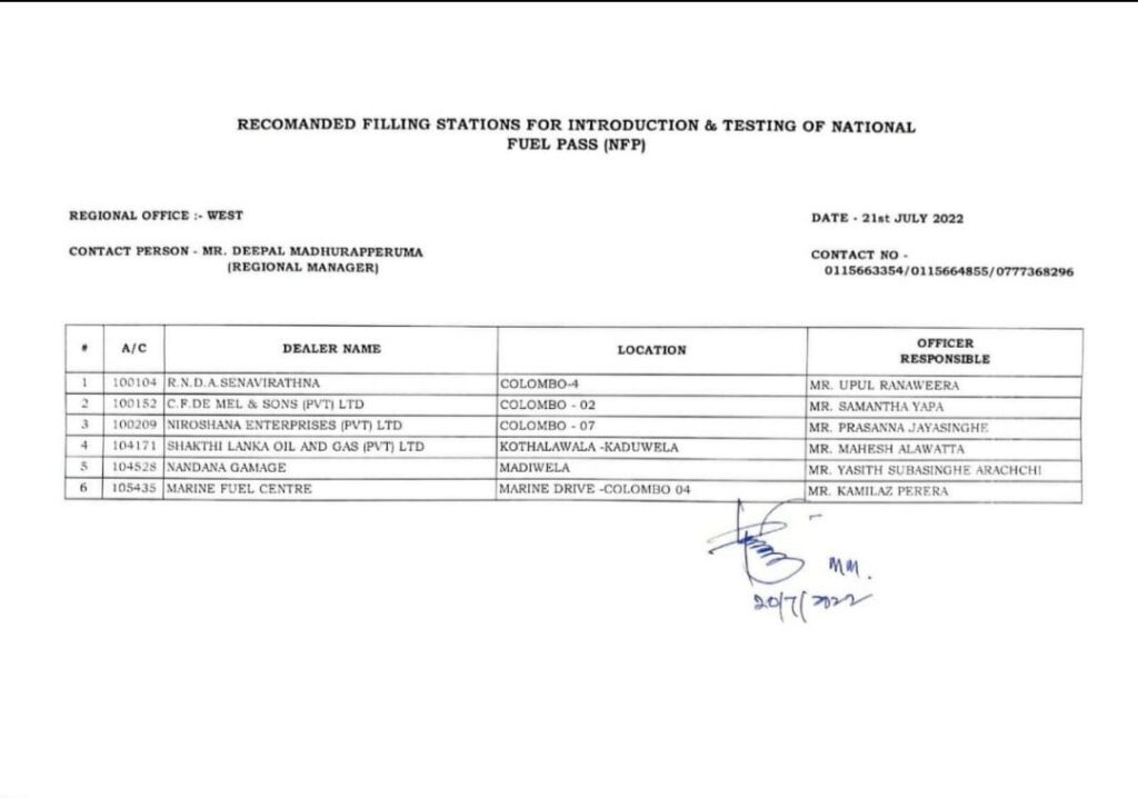 ඉන්ධන ලබාදීමේ ව්යාපෘතියක් ලෙස අලුතින් හදුන්වාදුන් QR ඛේත හදුනාගැනීමෙන් ඉන්ධන ලබා දීමේ වැඩපිළිවෙල අද කොළඹ ඉන්ධනහල් කිහිපයකදි නියමු ව්යාපෘතියක් ලෙස අත්හදා බැලීම සිදුකර තිබෙනවා. එ අනුව එක් එක් වාහනය සඳහා ලබා දී ඇති QR ඛේතය ස්කෑන් කර අදාල වාහනයට ලබා දීමට නියමිත ඉන්ධන ප්රමාණය ඉන්ධන පිරවුම් හල මගින් බෙදාහැරිම සිදුවෙනවා. ජූලි 21-24 දක්වා කොළඹ අවට ඉන්ධන පිරවුම් හල් කිහිපයකදි මෙලෙස ක්රියාත්මක වන මෙම ව්යාපෘතිය ජූලි 25 සිට දිවයින පුරා ක්රියාත්මක කිරීමට නියමිත බවයි බලශක්ති අමාත්ය වරයා ප්රකාශ කර සිටියේ. අද කොළඹ QR ඉන්ධන වැඩසටහන පරීකෂාව සිදු කළ ඉන්ධනහල් කිහිපය පහතින්.