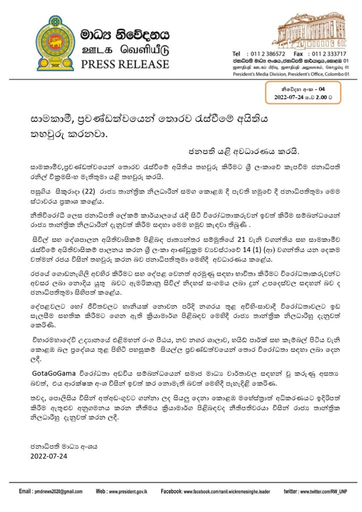 සාමකාමීව,ප්රචණ්ඩත්වයෙන් තොරව රැස්වීමේ අයිතිය තහවුරු කිරීමට ශ්රී ලංකාවේ කැපවීම ජනාධිපති රනිල් වික්රමසිංහ මැතිතුමා යළි තහවුරු කරයි. පසුගිය සිකුරාදා (22) රාජ්ය තාන්ත්රික නිලධාරීන් සමග කොළඹ දී පැවති හමුවේ දී ජනාධිපතිතුමා මෙම ස්ථාවරය ප්රකාශ කළේය. නීතිවිරෝධී ලෙස ජනාධිපති ලේකම් කාර්යාලයේ රැඳී සිටී විරෝධතාකරුවන් ඉවත් කිරීම සම්බන්ධයෙන් රාජ්ය තාන්ත්රික නිලධාරීන් දැනුවත් කිරීම සඳහා මෙම හමුව කැඳවා තිබුණි . සිවිල් සහ දේශපාලන අයිතිවාසිකම් පිළිබඳ ජාත්යන්තර සම්මුතියේ 21 වැනි වගන්තිය සහ සාමකාමීව රැස්වීමේ අයිතිවාසිකම් පාලනය කරන ශ්රී ලංකා ආණ්ඩුක්රම ව්යවස්ථාවේ 14 (1) (ආ) වගන්තිය යන දෙකම වත්මන් රජය විසින් තහවුරු කරන බව ජනාධිපතිතුමා මෙහිදී අවධාරණය කළේය.