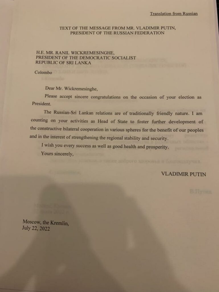 ශ්රි ලංකාවේ රුසියානු තානාපති Yury Materiy මහතා අද (25) ජනාධිපති රනිල් වික්රමසිංහ මහතා හමුවී තිබෙනවා. අභිනව ජනාධිපතිවරයාට රුසියානු ජනාධිපති Vladimir Putin මහතාගේ සුබ පැතුම් එක් කරමින් තානාපති වරයා විසින් රනිල් වික්රමසිංහ මහතාට ලිපියක් ඉදිරිපත් කර තිබෙන බව වාර්තා වනවා.