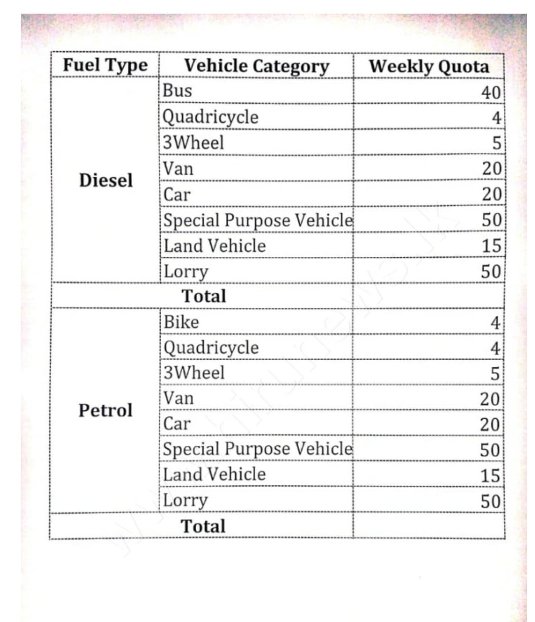 Q.R ක්රමවේදය යටතේ සතියකට එක් එක් වහාන සඳහා ලබාදෙන ඉන්ධන ප්රමාණය වැඩි කිරීමට තීරණය කර තිබෙනවා. ඒ අනුව එක් එක් වාහන කාණ්ඩය අනුව හිමි වෙන ඉන්ධන ප්රමාණය පහතින් දැක්වේ.
