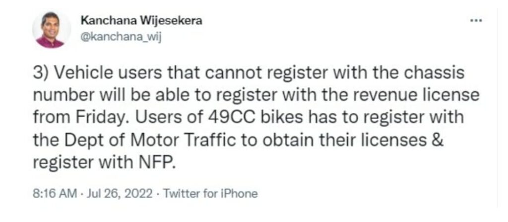 චැසි අංකය භාවිත කරමින් QR ඉන්ධන වැඩසටහන සඳහා ලියාපදිංචි විය නොහැකි අයට වාහනයේ ආදායම් බලපත්‍ර අංකය යොදාගනිමින් ලියාපදිංචි විමේ හැකියාව ලබන සිකුරාදා සිට ලබාදෙන බව බලශක්ති අමාත්‍ය කාංචන විජේසේකර පවසනවා. එමෙන්ම 49 CC යතුරු පැදි කාණ්ඩයේ QR ඉන්ධන අවසරපත්‍රය මෝටර් රථ ප්‍රවාහන දෙපාර්තමේන්තුව හරහා ලියාපදිංචි විය යුතු බවද ටුවිටර් පණිවිඩයක් තබමින් එතුමා ප්‍රකාශ කරනවා.