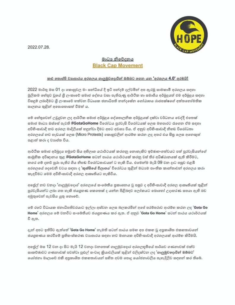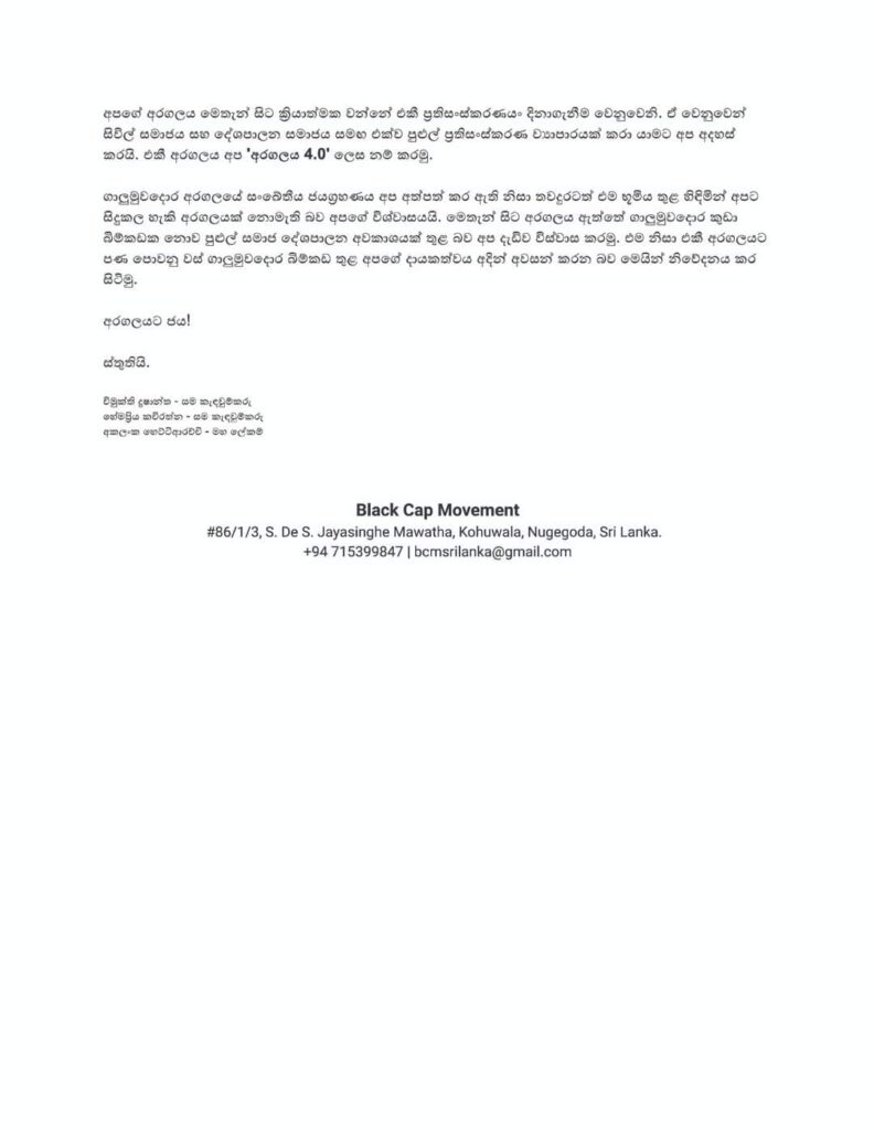 Black Cap Movement අරගලය ගාලුමුවදොරින් ඔබ්බට ගෙන යන ‘අරගලය 4.0’ අරඹයි! 2022 මාර්තු මස 01 දා කොහුවල මං සන්ධියේ දී ඉටි පන්දම් දල්වමින් අප ඇරඹූ සාමකාමී අරගලය සඳහා මූලිකම හේතුව වූයේ ශ්රී ලංකාවේ සමාජ දේහය වසා පැතිරුණු ආර්ථික හා සමාජීය අර්බුදයත් එම අර්බුදය සඳහා විසඳුම් ලබාදීමට ශ්රී ලංකාවේ හත්වන විධායක ජනාධිපති නන්දසේන ගෝඨාභය රාජපක්ෂගේ අත්තනෝමතික පාලනය තුළින් අපොහොසත් වීමත් ය. මේ හේතුවෙන් උඩුදුවන ලද ආර්ථික සමාජ අර්බුදය දේශපාලනික අර්බුදයක් දක්වා වර්ධනය වෙද්දී එතෙක් සමාජ මාධ්ය ඔස්සේ පැවති #GotaGoHome විරෝධය පුරවැසි විරෝධයක් ලෙස මහපාරට රැගෙන ඒම සඳහා අවිහිංසාවාදී නව අරගල මාදිලියක් හඳුන්වා දීමට අපට අවශ්ය විය. ඒ අනුව අවිහිංසාවාදී නිහඬ විරෝධතා අරගලයේ නව හැඩයක් ලෙස (Micro Protests) කොහුවලින් ආරම්භ කරන ලද අතර එය සීඝ්ර ලෙස අනෙකුත් පළාත් කරා ද ව්යාප්ත විය.