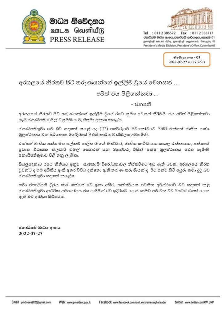 – 2022.07.27- ජනපති අරගලයේ නිරතව සිටි තරුණයන්ගේ ඉල්ලීම වුයේ රටේ ක්රමය වෙනස් කිරීමයි. එය අපිත් පිළිගන්නවා යැයි ජනාධිපති රනිල් වික්රමසිංහ මැතිතුමා ප්රකාශ කළේය. ජනාධිපතිතුමා මේ බව සඳහන් කළේ ඊයේ (27) පස්වරුවේ පිටකෝට්ටේ පිහිටි එක්සත් ජාතික පක්ෂ මූලස්ථානය වන සිරිකොත මන්දිරයේ දී එහි කාර්ය මණ්ඩලය අමතමිනි. එක්සත් ජාතික පක්ෂ මහ ලේකම් පාලිත රංගේ බණ්ඩාර, ජාතික සංවිධායක සාගල රත්නායක, පක්ෂයේ ප්රධාන විධායක නිලධාරී ශමල් සෙනරත් යන මහත්වරු විසින් පක්ෂ මූලස්ථානය වෙත පැමිණි ජනාධිපතිතුමාව පිළි ගනු ලැබිණ. සියලුදෙනාට රටේ නීතියට අනුව සාමකාමී විරෝධතාවල නිරතවීමට ඉඩ ඇති බවත්, අරගලයේ නිරත වූවන්ට ද එම අයිතිය ඇති අතර විවිධ දක්ෂතා ඇති තරුණ තරුණියන් ද ඊට එක්ව සිටි අයුරු තමා දුටු බව ජනාධිපතිතුමා සඳහන් කළේය. තමා ජනාධිපති ධූරය භාර ගත්තේ රට ඉතා අසීරු තත්ත්වයක පවතින අවස්ථාවේ බව සඳහන් කළ ජනාධිපතිතුමා ආර්ථික අභියෝගය ජය ගනිමින් රට ඉදිරියට ගෙන යාමට මේ වන විට පියවර රැසක් ගෙන ඇති බව ද කියා සිටියේය.