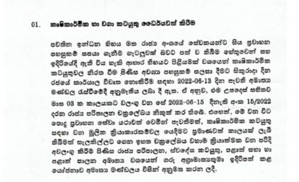 රට තුළ පවතින ඉන්ධන අර්බුදය හා ප්‍රවාහන දුශ්කරතා හේතුවෙන් ආහාර හිඟයට පිළියමක් ලෙස කෘෂිකර්මික කටයුතු වල නිරත වීම සඳහා රාජ්ය සේවකයින් හට ලබා දී තිබූ සිකුරාදා නිවාඩුව යළි අවලංගු කිරීමට තීරණය කර තිබෙනවා. පොදු ප්‍රවාහන සේවය යථාතත්වයට පත්වීමත් කෘෂිකර්මික වගා කටයුතු වල මූලික අවස්ථාවන් සඳහා අවශ්‍ය කාළය ප්‍රමාණවත් වීමත් යන හේතූන් නිසා සිකුරාදා දිනයේ යළි සේවයට කැඳවීමට තීරණය කර ඇති බවයි වාර්තා වන්නේ.