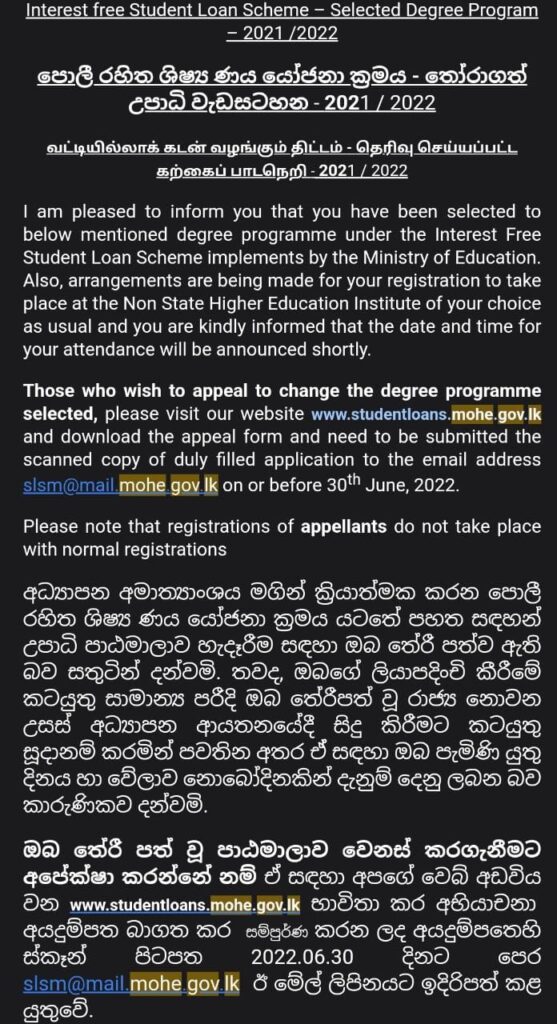 මෙ පිළිබඳව අමාත්ය මණ්ඩලය විසින් කඩිනම් තීරණයක් නොගතහොත්,2017 වසරේදී රනිල් වික්රමසිංහ මහතාගේ ආණ්ඩු සමයේ හඳුන්වා දුන් විශේෂිත අධ්යාපනික ණය යෝජනා ක්රමය අඛණ්ඩව පවත්වාගෙන යාමට බාධා මතු වනු ඇති