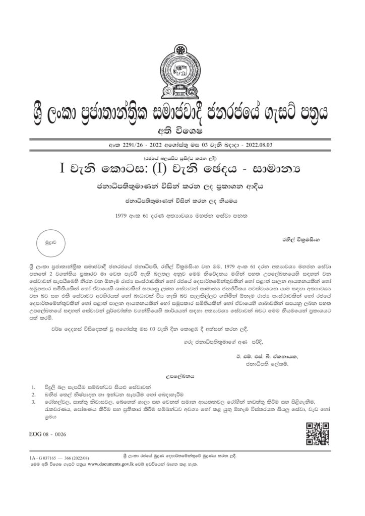 රාජ්ය සේවාවන් කිහිපයක් අත්යවශ්ය සේවා බවය පත්කරමින් විශේෂ ගැසට් නිවේදනයක් ජනාධිපතිවරයා විසින් නිකුත්කර තිබෙනවා. විදුලි, ඛනිජ තෙල්, රෝහල් යන සේවාවන් මෙලෙස අත්යවශ්ය සේවාවන් බවට පත් කර නිවේදනය නිකුත් කර තිබෙනවා.