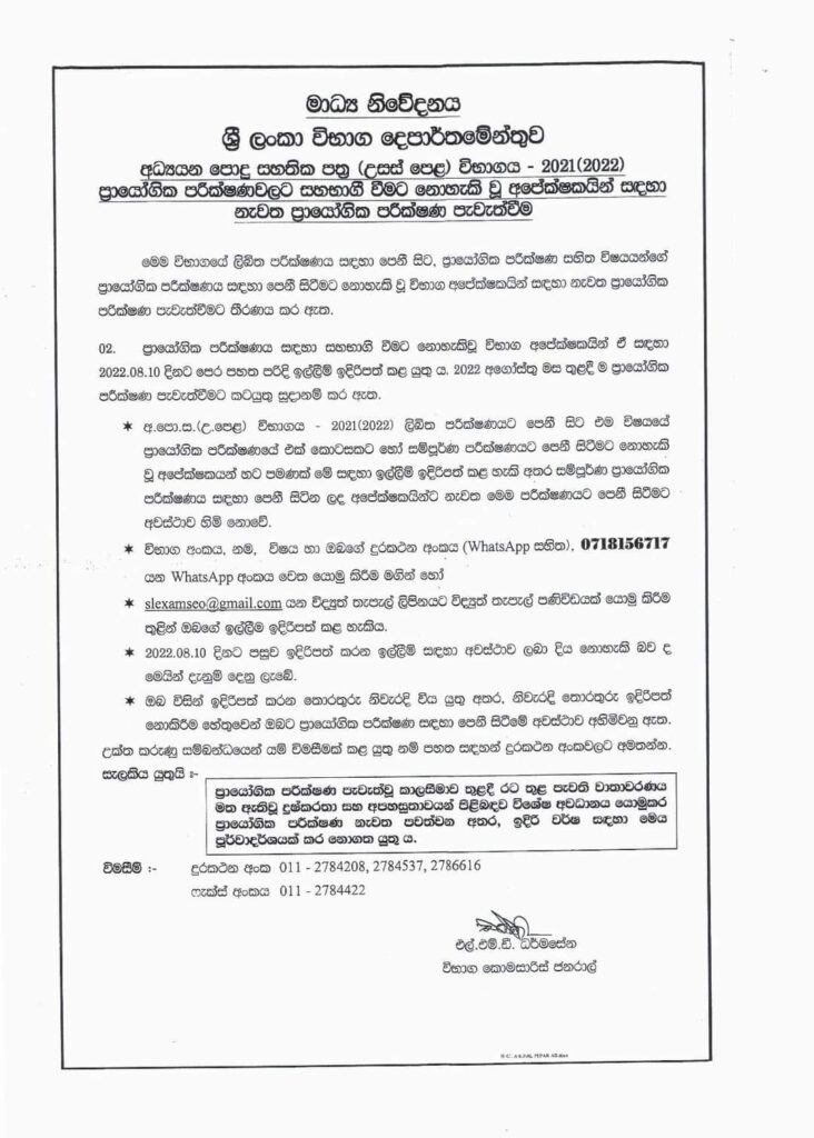 අ.පො.ස( උ.පෙළ) 2021 (2022) විභාගයේ ප්රායෝගික පරීක්ෂණවලට සහභාගී වීමට නොහැකි වූ අපේක්ෂකයින් සඳහා අගෝස්තු මස තුළදී නැවත ප්රායෝගික පරික්ෂණ පැවැත්වෙන බව ශ්රී ලංකා විභාග දෙපාර්තමේන්තුව ප්රකාශ කර සිටිනවා.