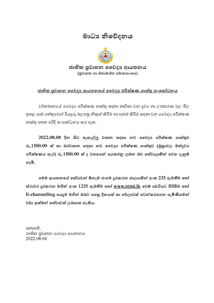 රියදුරු බලපත්රය සඳහා සිදුකරනු ලබන වෛද්ය පරීක්ෂණ ගාස්තු ඉහළ දැමීමට ජාතික ප්රවාහන වෛද්ය ආයතනය තීරණය කර තිබෙනවා. ඒ අනුව අගෝස්තු 08 දා සිට වෛද්ය පරීක්ෂණය සඳහා වන පරික්ෂණ ගාස්තුව රුපියල් 1500 ක් දක්වා ඉහළ යෑමට නියමිතයි.