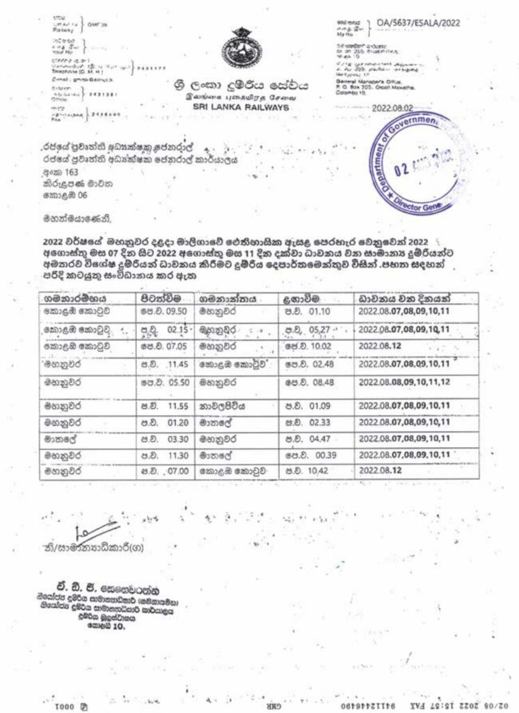 අදාළ දුම්රිය කාලසටහන පහතින්