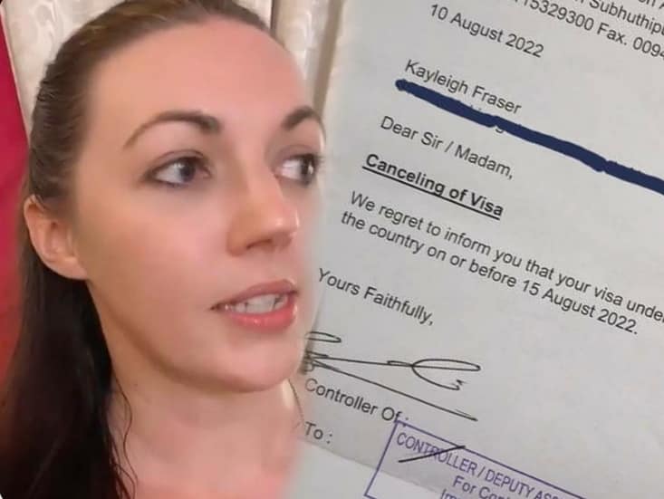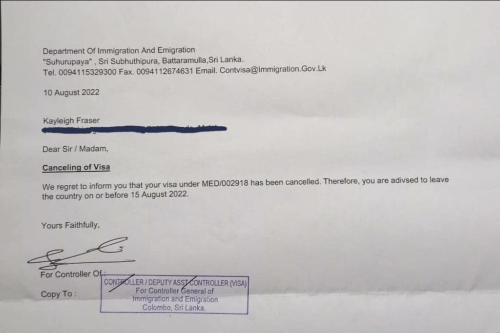 ගාලුමුවදොර පැවැති ජනතා අරගලයට සමාජ මාධ්‍ය ඔස්සේ ප්‍රචාරයන් සිදු කළ බ්‍රිතාන්‍ය ජාතික තරුණියක් වන කයිස් ෆ්‍රේසර් ගේ මෙරට රැදී සිටීමට අවසර හිමි වෙන වීසා බලපත්‍රය ආගමන විගමන දෙපාර්තමේන්තුව විසින් අවලංගු කර තිබෙනවා. MED 002918 දරණ, ඇයගේ වෛද්‍ය හේතුන් මත නිකුත් කර තිබූ වීසා බලපත්‍රය අවලංගු කරන බවට ආගමන විගමන දෙපාර්තමේන්තුව විසින් ඇයට දැනුම් දී ඇති අතර ඇය තම Facebook ගිණුමේ එය පළ කර තිබුණා. එළැබෙන 15 වනදාට පෙර මෙරටින් පිටව යන ලෙසයි නිවේදනයෙන් ඇයට දැනුම් දී තිබුණේ.