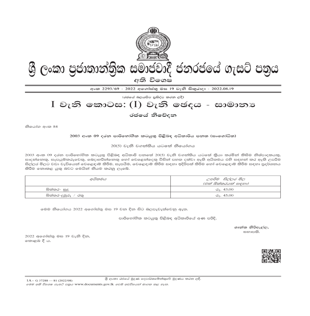 බිත්තර සඳහා වන උපරිම සිල්ලර මිල නියම කරමින් අතිවිශේෂ ගැසට් නිවේදනයක් නිකුත් කර තිබෙනවා. ඒ අනුව රතු බිත්තරයක මිල රුපියල් 45 ක් ලෙසත් , සුදු බිත්තරයක උපරිම සිල්ලර මිල රුපියල් 43 ක් වශයෙන් සඳහන් කරමින් ගැසට් නිවේදනය නිකුත් කර තිබෙනවා.