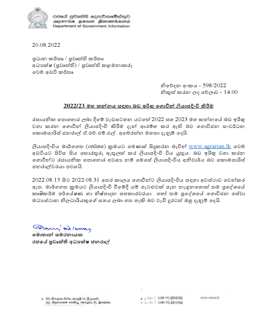 2022 සහ 2023 වසර සඳහා මහ කන්නයේ බඩ ඉරිඟු වගා කරන ගොවීන් සඳහා රසායනික පොහොර ලබාදීමේ ලියාපදිංචි කටයතු ආරම්භ කර ඇති බව ගොවිජන සංවර්ධන කොමසාරිස් ජනරාල්වරයා පවසනවා.