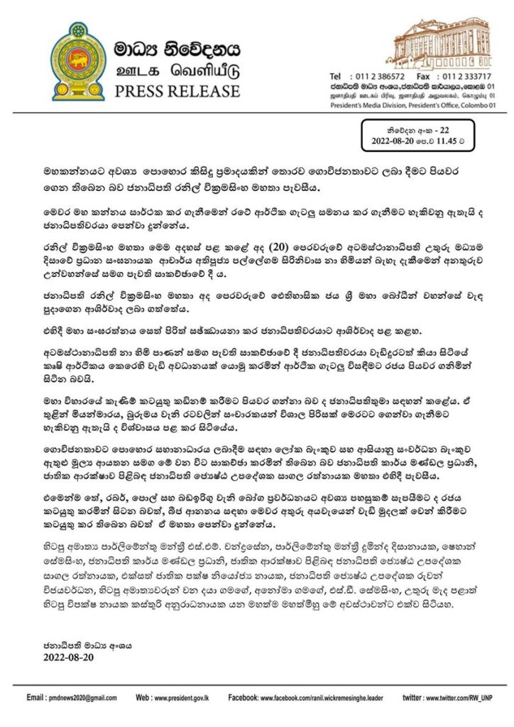 ගොවි ජනතාවට අවශ්ය පොහොර සහනාධාර ලබාදීම සඳහා ලෝක බැංකුව සහ ආසියානු සංවර්ධන බැංකුව ඇතුළු මූල්ය ආයතනයන් සමඟ මේවන විට සාකච්ඡා ආරම්භ කර ඇති බව ජනාධිපති මාධ්ය අංශය නිවේදනයක් නිකුත් කරමින් ප්රකාශ කරනවා.