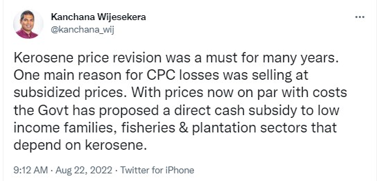 ඛනිජ තෙල් සංස්ථාව පාඩු ලබන ආයතනයක් බවට පත්වීමට එක් හේතුවක් වූයේ සහනාධාර මිලට භූමිතෙල් අලෙවිකිරීම බවත් වැඩි කර ඇති නව මිල ගණන් පිරිවැයට සමපාත වී ඇති බවත් බලශක්ති අමාත්යවරයා පවසනවා. අඩු ආදායම්ලාභී පවුල්, ධීවර සහ වැවිලි ක්ෂෙත්ර සඳහා ඍජු මුදල් සහනාධාරයක් ලබා දීමට රජය සූදානම් කර ඇති බවයි අමාත්යවරයා ටුවිටර් සටහනක් තබමින් වැඩිදුරටත් සඳහන් කර සිටියේ.