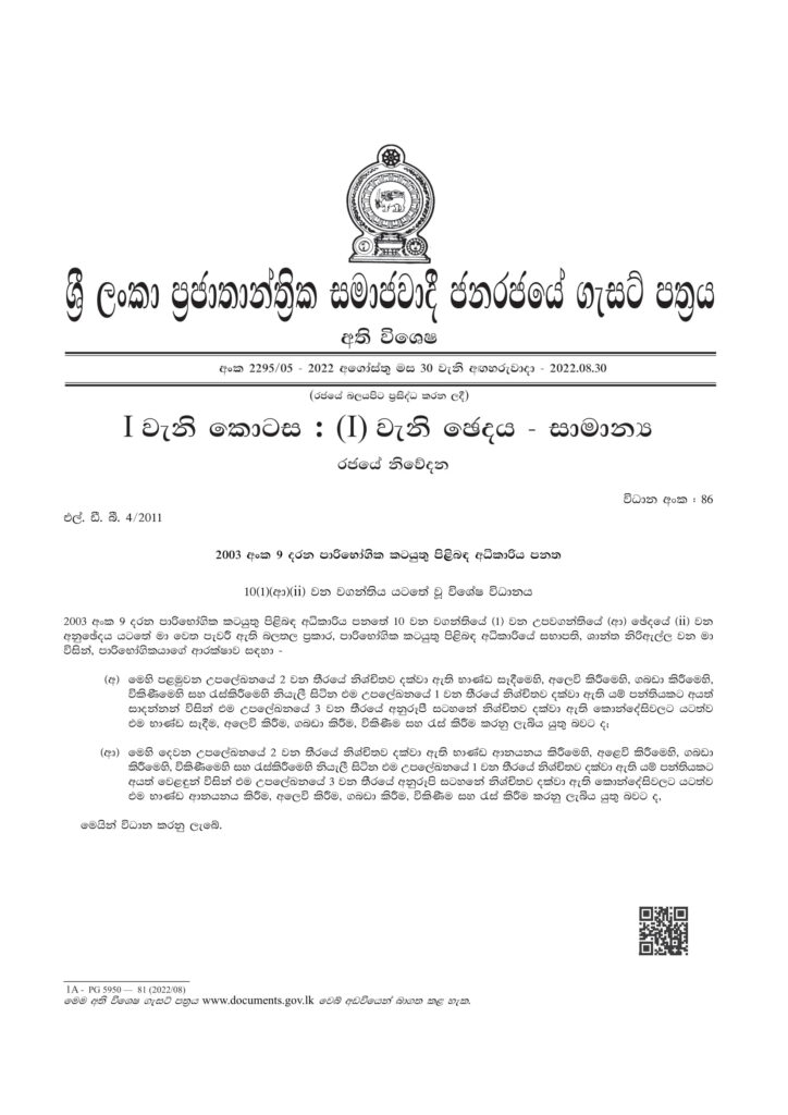 අදාළ භාණ්ඩ සහ කොන්දේසි ඇතුළත් ගැසට් නිවේදනය පහතින්,