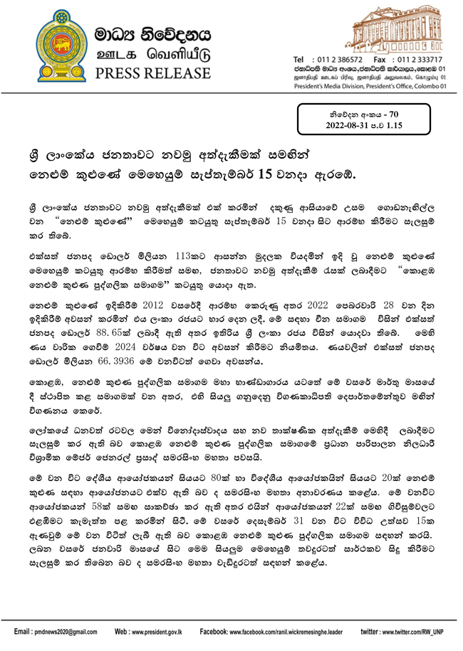 නෙළුම් කුළුණේ මෙහෙයුම් සැප්තැම්බර් 15 වනදා සිට ආරම්භ කිරීමට නියමිත බව ජනාධිපති මාධ්ය අංශය ප්රකාශ කරනවා.