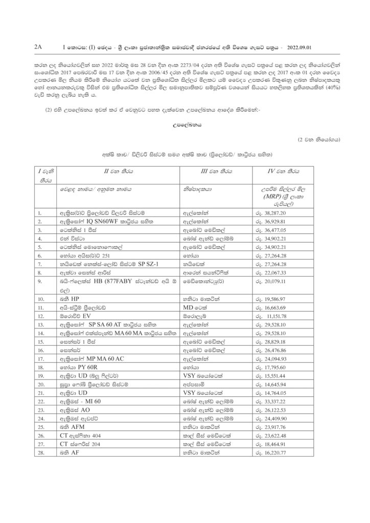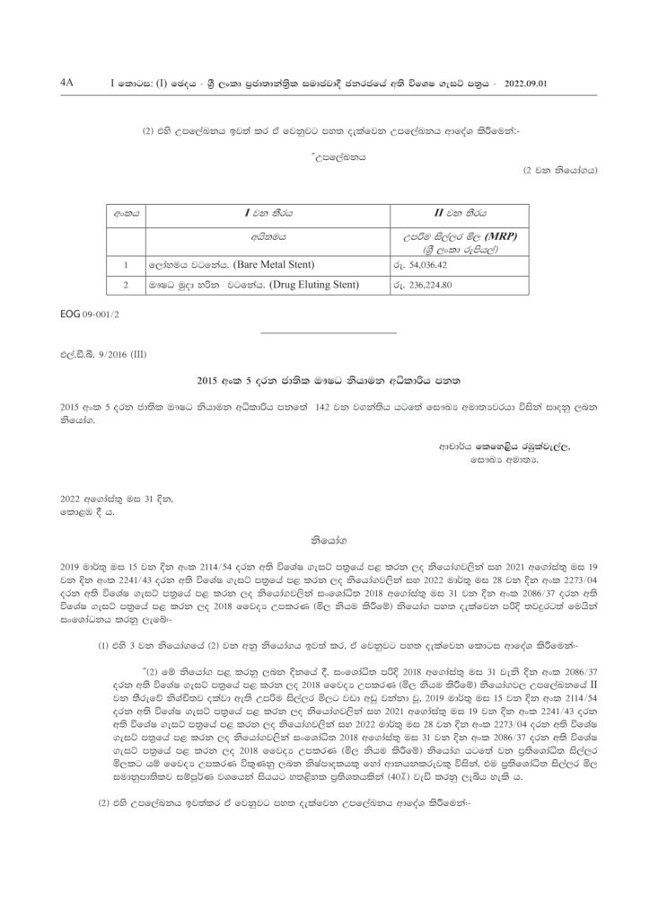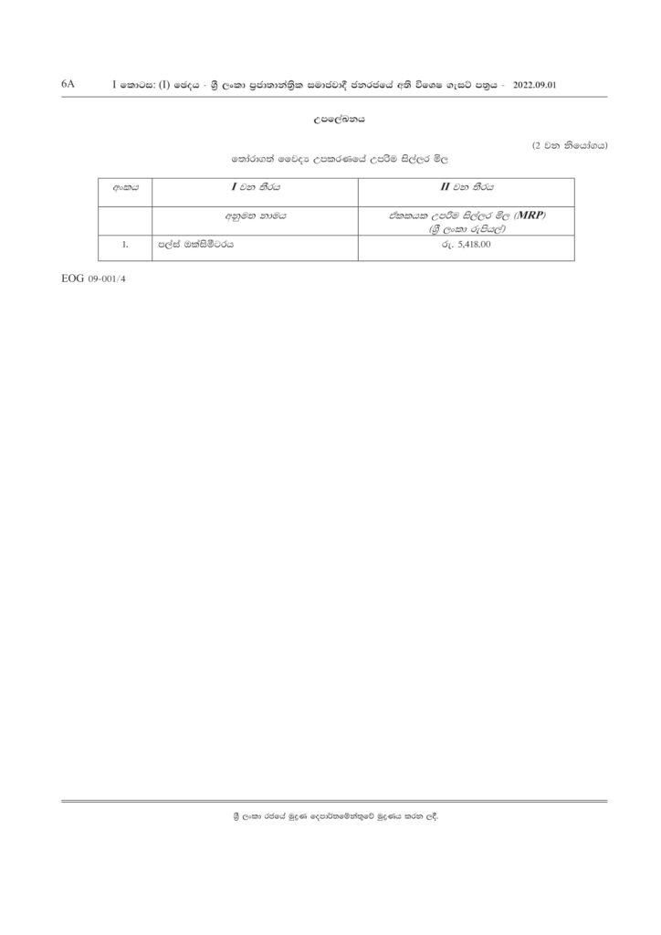 වෛද්ය උපකරණ වර්ග 43ක මිල සංශෝධනය කරමින් අති විශේෂ ගැසට් නිවේදනයක් නිකුත් කර තිබෙනවා.
