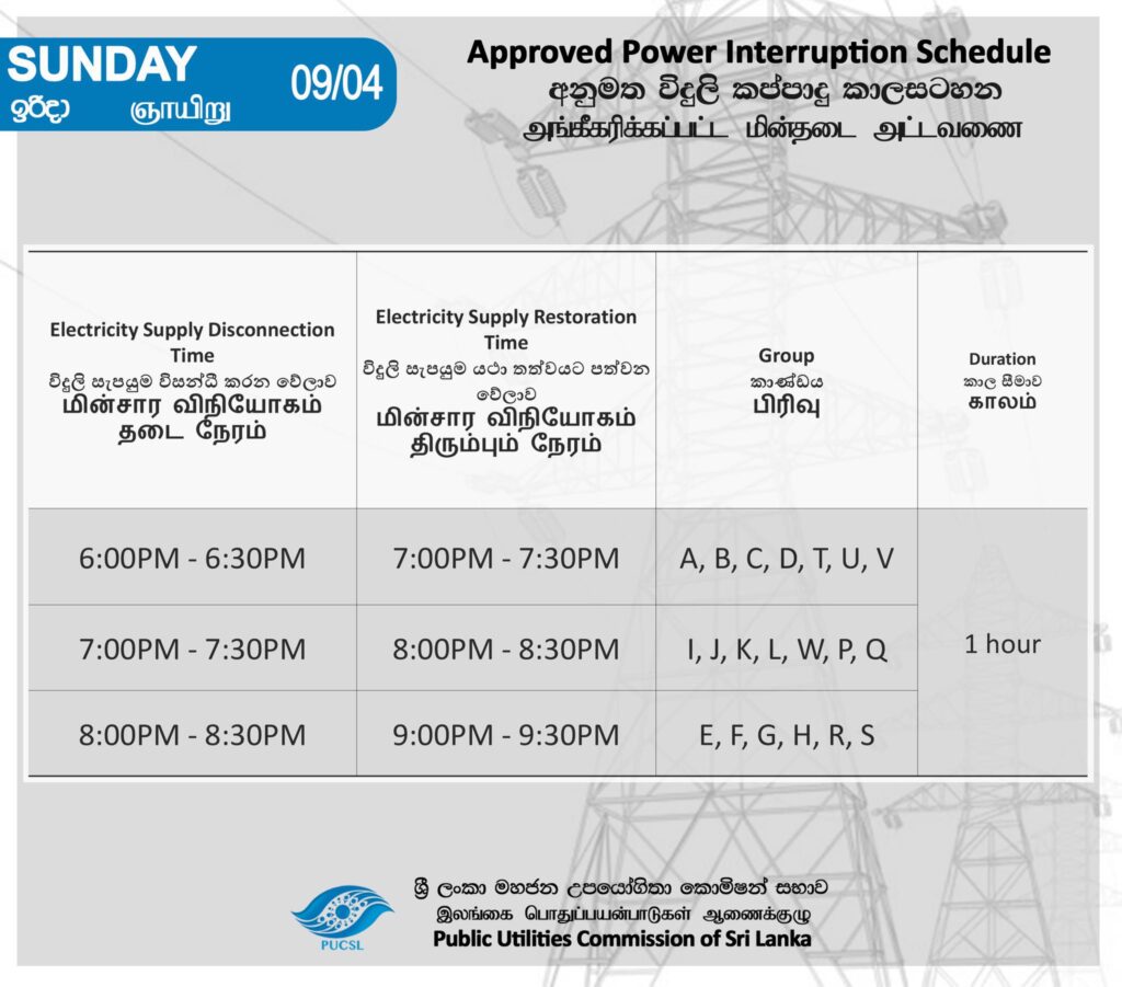 අද (04) දිනයේ විදුලි කප්පාදුව සිදු කිරීමට නියමිත ආකාරය මහජන උපයෝගිතා කොමිසම විසින් නිවේදනය කරනවා.