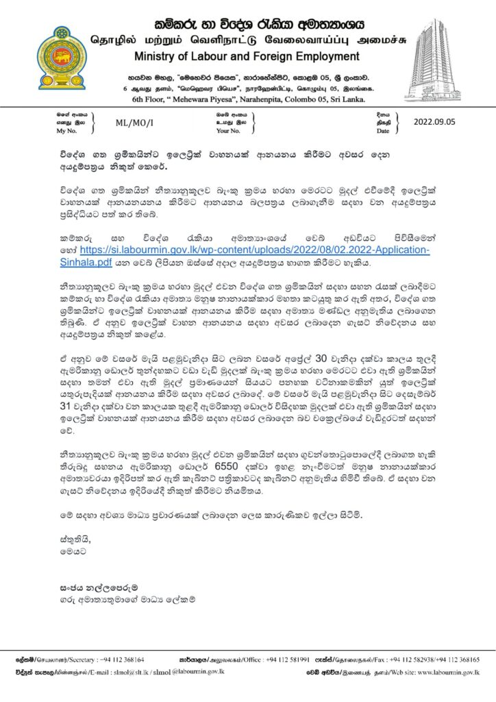 විදේශ ගත ශ්රමිකයින් නීත්යානුකූලව බැංකු ක්රමය හරහා මෙරටට මුදල් එවීමේදී ඉලෙට්රික් වාහනයක් ආනයනයනය කිරීමට ආනයනය බලපත්රය ලබාගැනීම සදහා වන අයදුම්පත්රය ප්රසිද්ධියට පත් කර තිබේ.