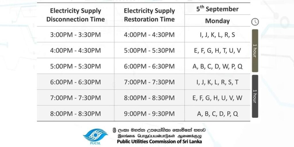 අද (05) දිනයේ විදුලි කප්පාදුව සිදු කිරීමට නියමිත ආකාරය මහජන උපයෝගිතා කොමිසම විසින් නිවේදනය කරනවා.