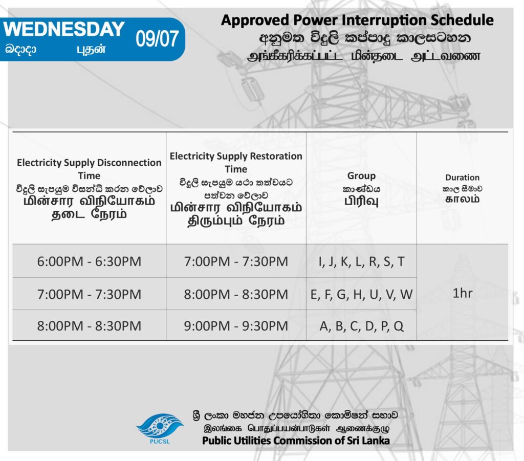 අද (07) දිනයේ විදුලි කප්පාදුව සිදු කිරීමට නියමිත ආකාරය මහජන උපයෝගිතා කොමිසම විසින් නිවේදනය කරනවා.