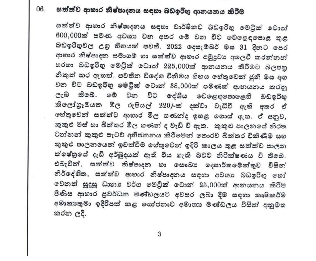 වෙළඳ පොළ තුළ බඩඉරිඟු මිල ඉහළ යෑම නිසා ඊට සමගාමීව සත්ත්ව ආහාර වල මිල ද ඉහළ යන බැවින්, කුකුළු පාලනය වැනි සත්ත්ව පාලන කටයුතුවල නිරත වන්නන් හට ගැටුලු රැසකට මුහුණ දීමට සිදුවීම අවම කර ගැනීම සඳහා නිසා සත්ත්ව ආහාරයට සුදුසු ධාන්ය මෙට්රික් ටොන් 25,000 ක් ගෙන්වීමට කෘෂිකර්ම අමාත්යාංශය ඉදිරිපත් කළ යෝජනාවට කැබිනට් අනුමැතිය හිමිව තිබෙනවා.