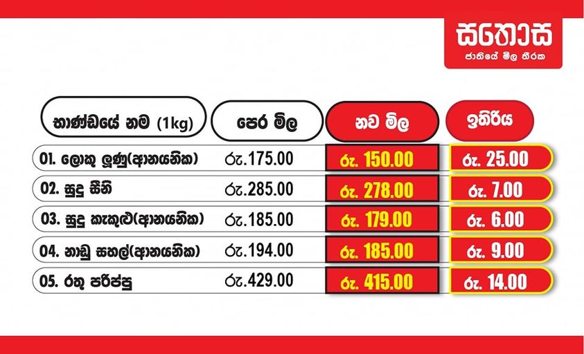 අත්යවශ්ය භාණ්ඩ කිහිපයක මිල අඩු කිරීමට ලංකා සතොස තීරණය කර තිබෙනවා. මෙලෙස මිල අඩු කරන ලද භාණ්ඩ දිවයින පුරා පිහිටි සතොස අලෙව්සැල් මඟින් පාරිභෝගිකයන්ට ලබාගත හැකි වෙනවා.