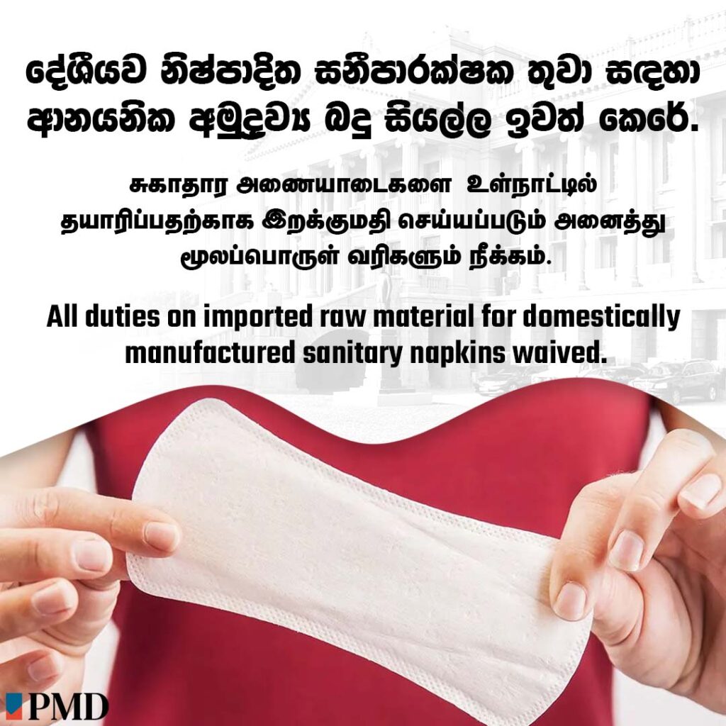 කාන්තාවන් සහ පාසැල් දැරියනට සනීපාරක්ෂක තුවා පහසුවෙන් ලබා දීම අරමුණු කරගෙන දේශීයව නිෂ්පාදනය කෙරෙන සනීපාරක්ෂක තුවා සඳහා යොදාගනු ලබන අනයනික අමුද්රව්ය 05 ක බදු බර ඉවත් කිරීමට තීරණය කර තිබෙනවා.