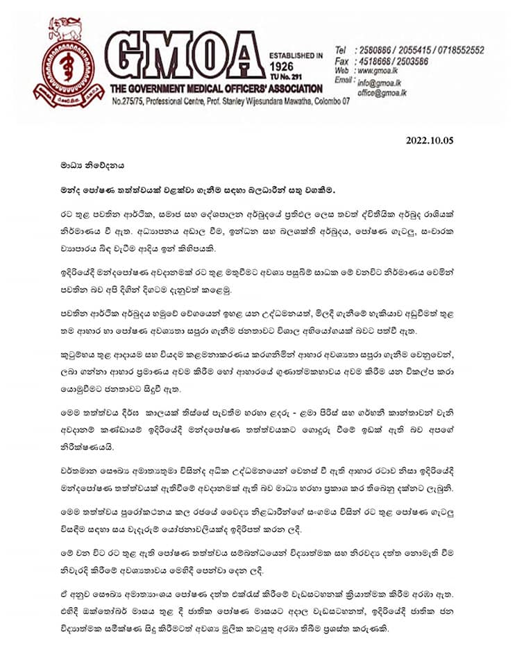 පෝෂණ අවශ්යතාවන් සපුරාගැනීමේදී මෙරට ජනතාව මුහුණදී සිටින ගැටලු ඉදිරියේදී රට තුළ මන්දපෝෂණ තත්වයක් ඇති කිරීමට හේතුවන බව රජයේ වෛද්ය නිලධාරීන්ගේ සංගමය පෙන්වා දෙනවා.