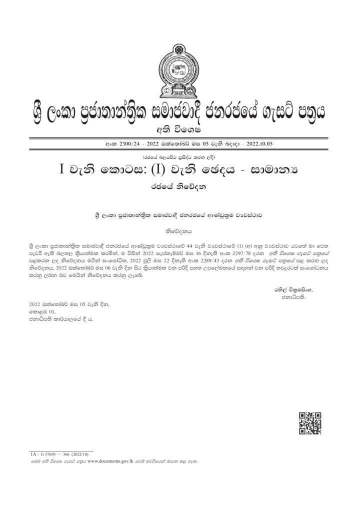 අදාළ ගැසට් නිවේදනය පහතින්,