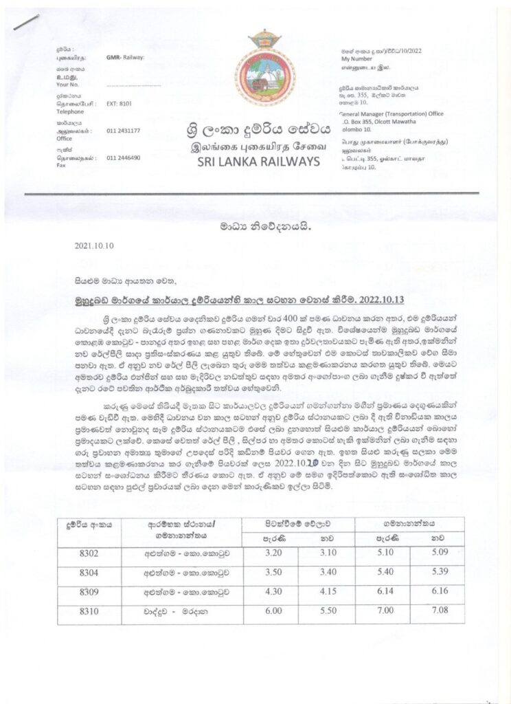 ඉහත කරුණු හේතුවෙන් මුහුදුබඩ මාර්ගයේ දුම්රිය ගමනාගමනය සඳහා සංශෝධනය කර ඇති නව දුම්රිය කාලසටහන, 2022 – 10 – 20 සිට ක්රියාත්මක කිරීමට නියමිත බව ශ්රී ලංකා දුම්රිය දෙපාර්තමේන්තුව දැනුම් දෙනවා.